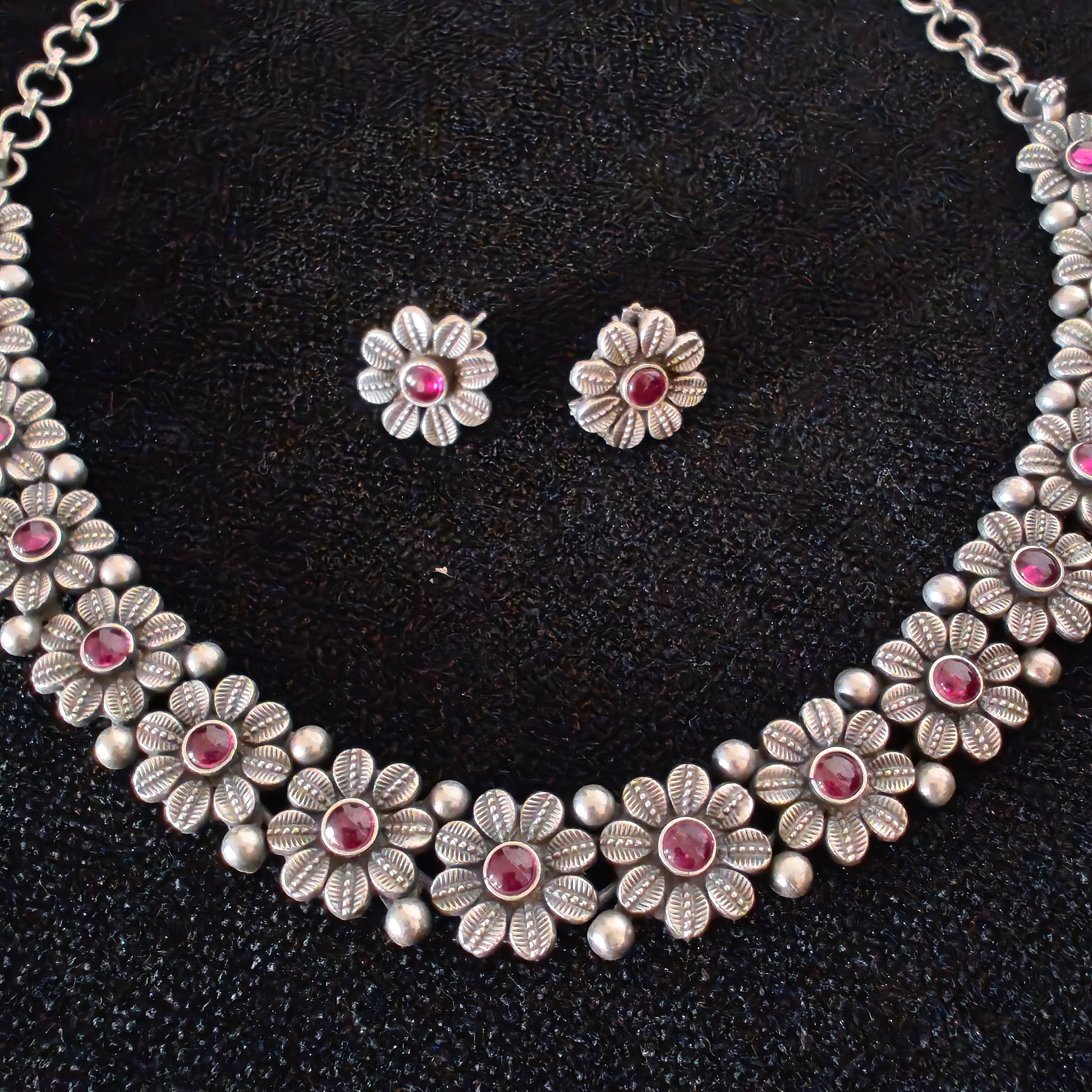 925 Silver Choker Temple Necklace Set With Intricate Design Red Stone And Matching Stud Earrings