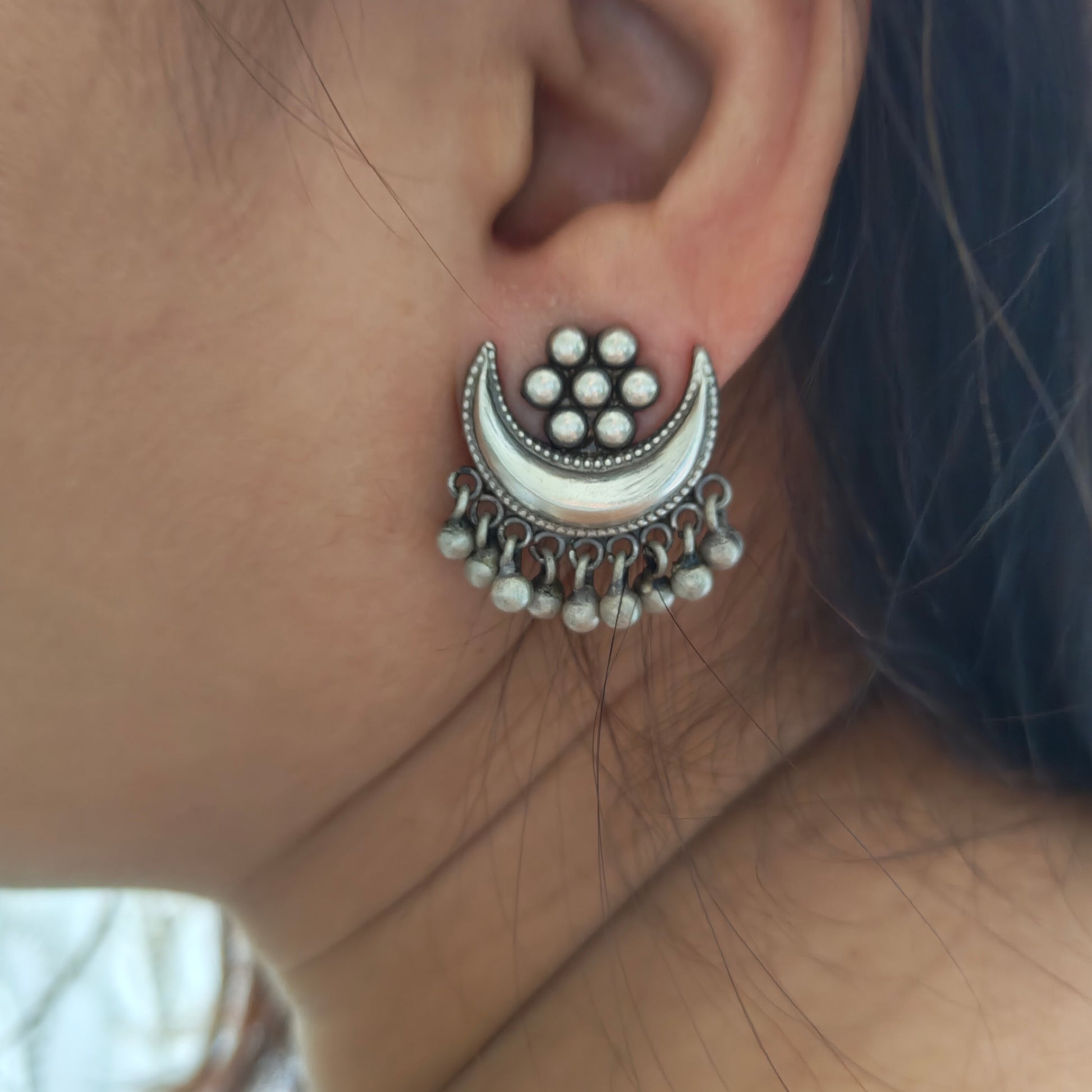 - 925 Silver Red Stone Pear Stud Chand Dangler Temple Earrings With Intricate carvings925 Silver Kudi Flower Stud One Chand Dangler Temple Earrings With Intricate carvings Silver Ball Drops
