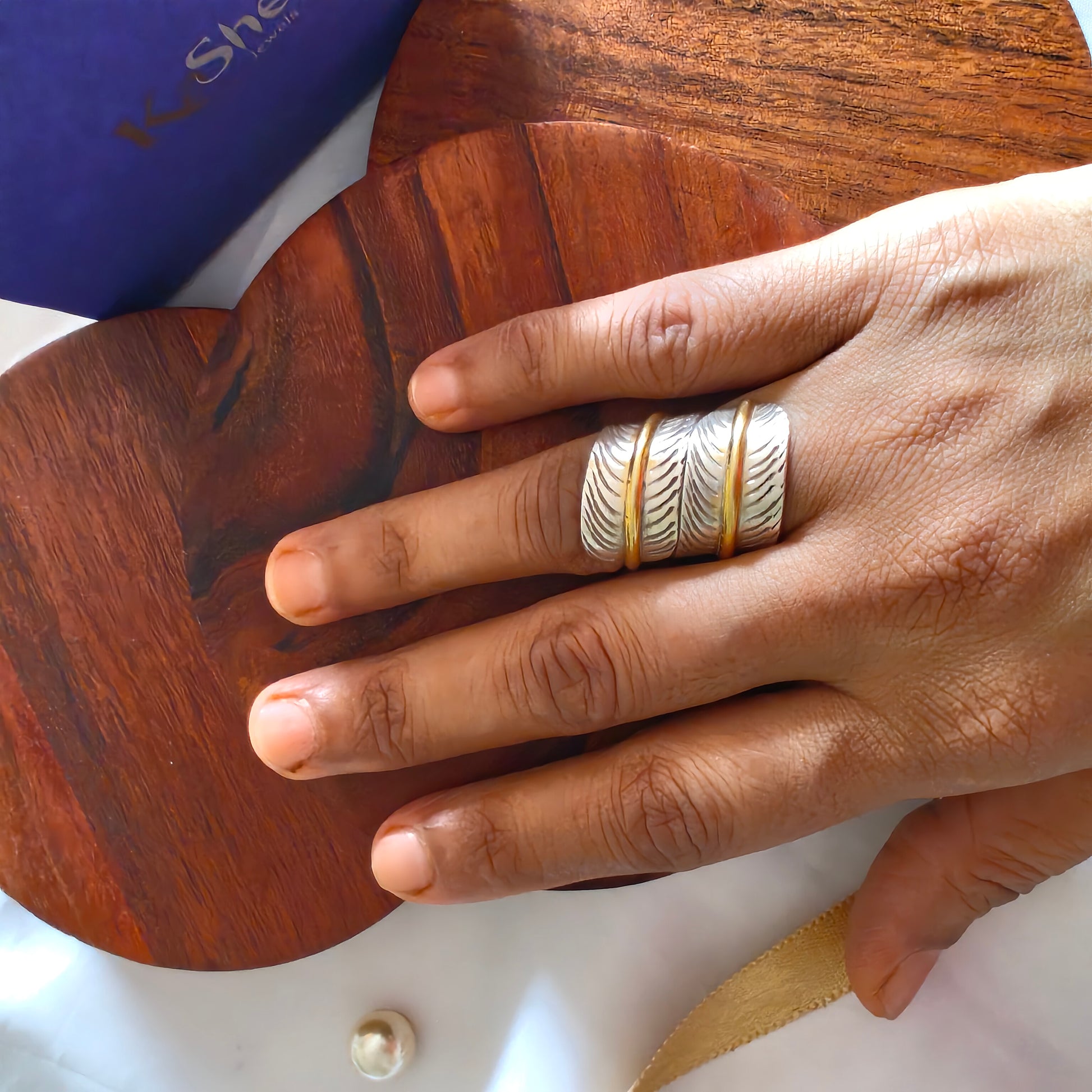 Boho Dual Tone Adjustable Textured Spiral Leave Sterling Silver Ring