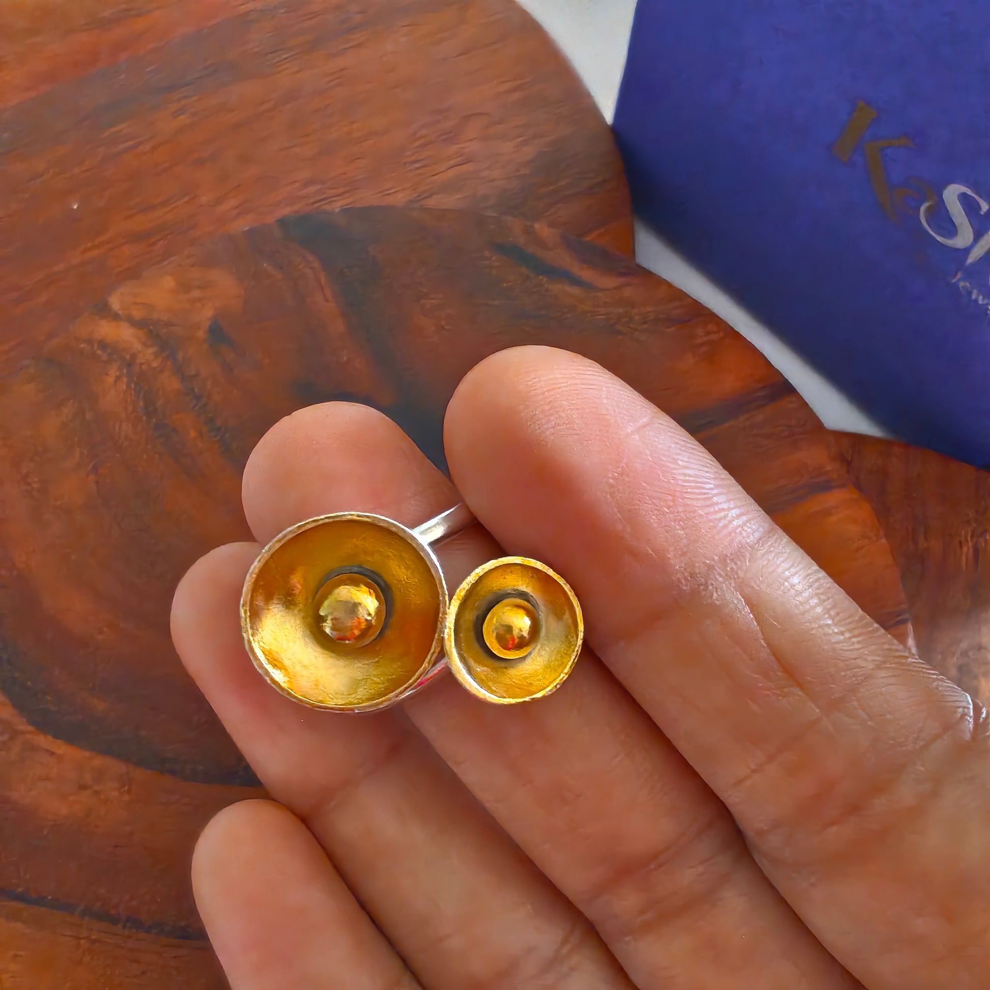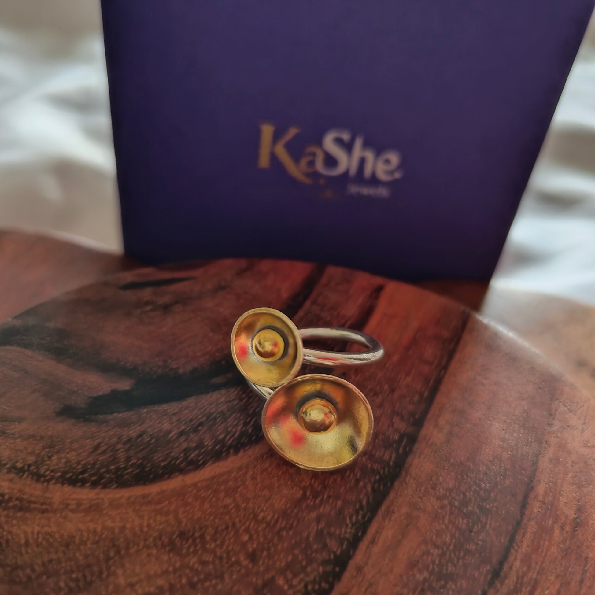 Boho Dual Tone Adjustable Sterling Silver Ring With Dual Buttercup Flowers